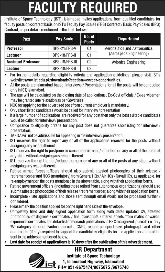 Institute of Space Technology IST Faculty Jobs 2025 announced for Professor, Assistant Professor and Lecturer posts in Aerospace and Avionics Engineering. Apply within 10 days.
